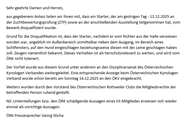 Der Vorstand des Österreichischer Rottweiler Klub teilt ergänzend mit, dass Herr R. G. seit Juli 2025 kein Mitglied mehr im Österreichischen Rottweiler Klub ist.