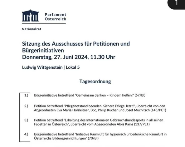 Zur Information: Ich habe heute gegen 11.30 Uhr die Ehre vor den Abgeordneten des Parlament im Petitionsausschuss meine Expertise in einer Rede zur Petition "Erhalt des Internationalen Gebrauchshundesports in all seinen Facetten in Österreich " mitzuteilen.